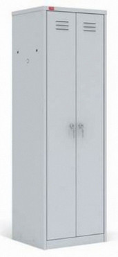 Шкаф металлический разборный двухсекционный, предназначен для хранения сменной одежды. В стандартную комплектацию каждой секции входят съемная полка для головного убора, перекладина для вешалки и крючки для одежды. Шкаф оснащен врезным замком.